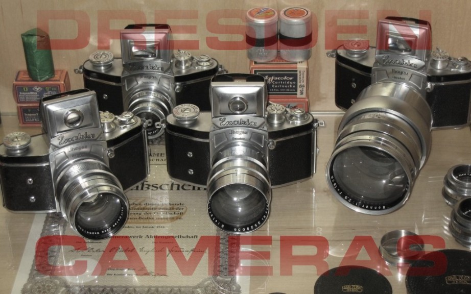 Modern photography became popular with the first SLR camera - the legendary Kine-Exakta, made by Ihagee in Dresden Germany in 1936. It used the new developed 35mm film cartridges and lens makers like Carl Zeiss (Jena), Schneider (Kreuznach) or Meyer (Görlitz) provided a wide variety of excellent exchangeable lenses to the modern camera system. After WW2 Ihagee introduced the Varex system, with exchangeable viewfinders, a variety of prisms and the Stereflex system for 3-dimensional imaging. Below pictured with attachable TTL lightmeter, beamsplitters for 50mm lenses and close-up imaging as well as a stereo-viewer from Carl Zeiss with color corrected backlight filter.